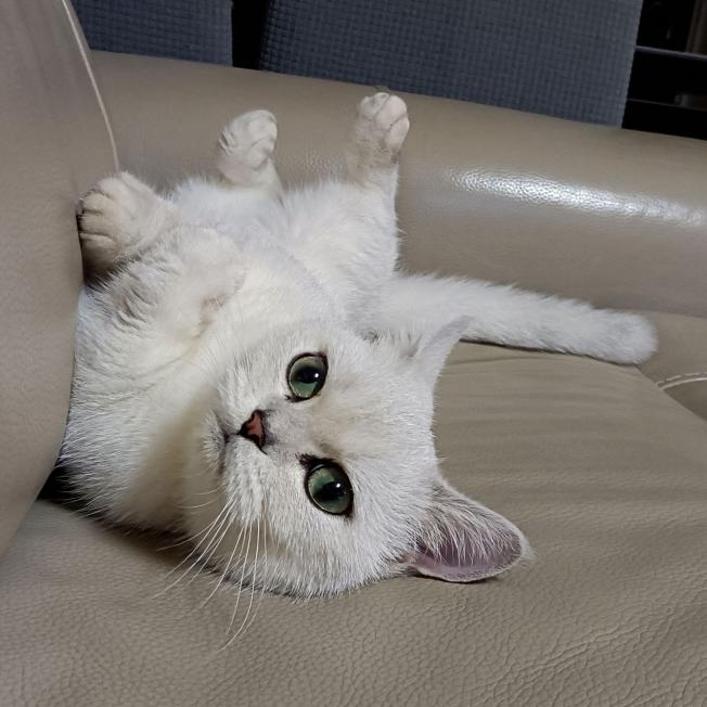 银渐层,大胆好奇心重,毛色大部分为白色,背部为银色,有层次感,眼睛随着年龄不同呈现黄绿,蓝绿色,而且自带眼线!