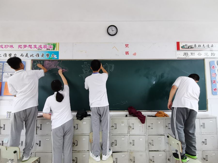 同学们在班委的带领下正在进行黑板报的编排