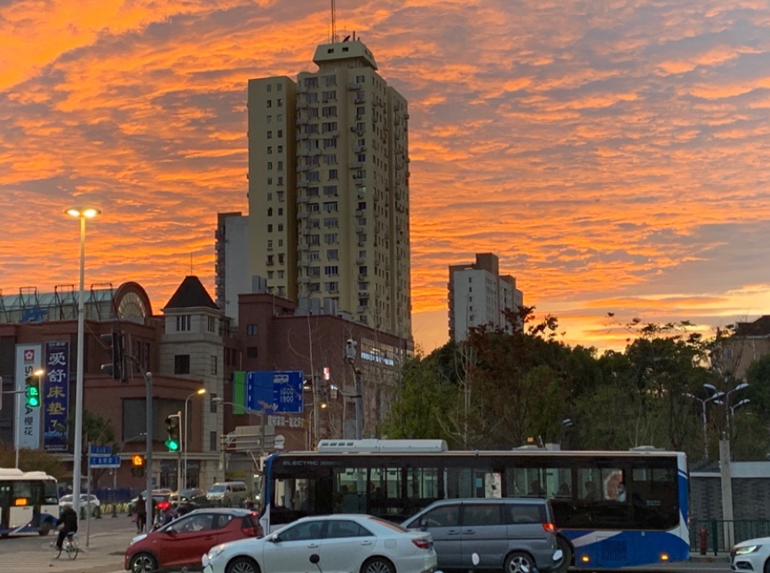 在回家的时候,抬眸发现了炙热如火的晚霞,天上的白云一层疊着一层,呈鳞状分布着。在落日余晖的照耀下,像是金子在天上发着亮光呢!晚霞的颜色瞬息万变,一会儿红彤彤的,一会儿金灿灿的,一会儿又变成了淡紫色….有些颜色还是生活中比较少见的,那是只有晚霞和朝才拥有的色彩。没过一会天就黑了,晚霞转瞬即逝,就像是从未来过。但在看见了它的人的记忆深处,又留下了浓墨重彩的一笔。似是点燃了的蜡烛,在熄灭前仍然以最美的一面照亮世界……