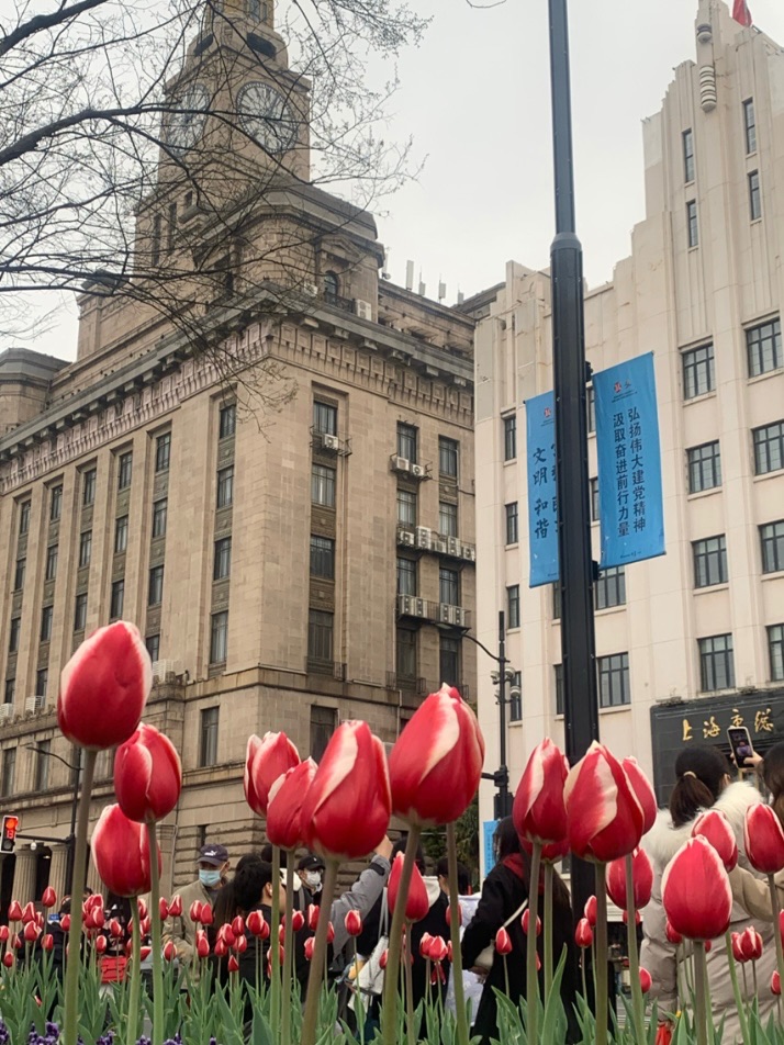在外滩边,另一幅美景也在人心中烙下深深的印记。一朵朵红色粉色的郁金香花,在黄浦江边的绿地上伫立,她的姿态是高傲的,是优雅的,是美而不自知的。那粉红相间的花瓣一层包着一层,绿色的枝干说得上一句“不蔓不枝”,她的身姿挺拔而秀丽,似是一位位亭亭玉立的少女。她为沉寂的钟楼带来了色彩与生机,为还未长出新叶的枯树点缀了整个初春!