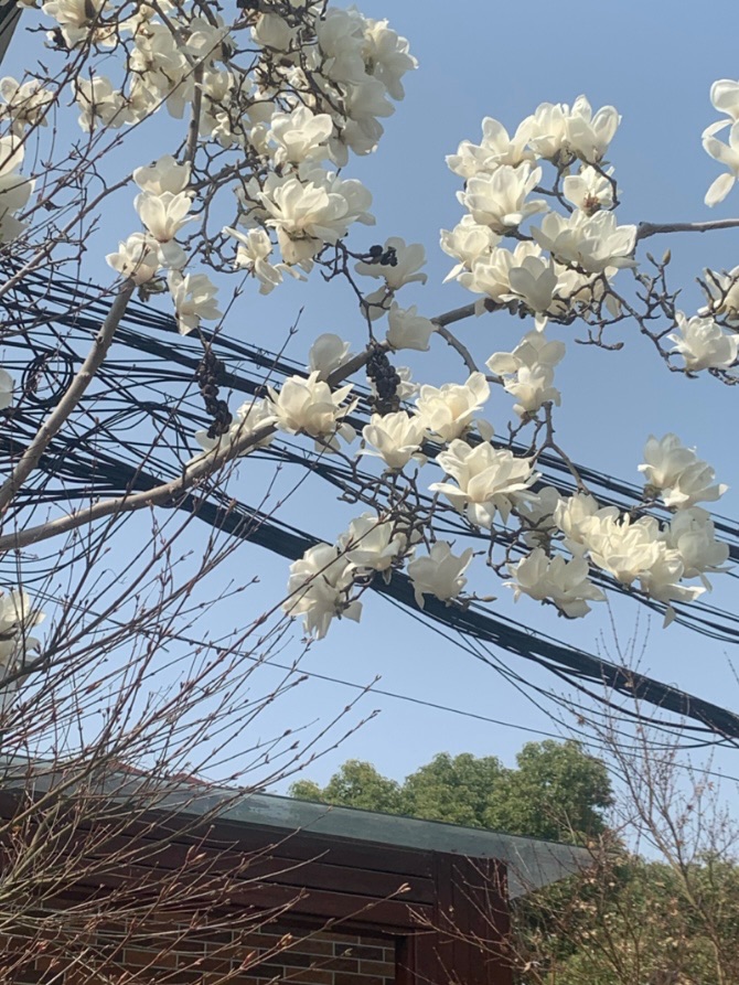 上海的白玉兰也在这春光的照耀下纷纷绽放,露出自己最美的模样。那一朵朵盛开在枝丫上的,是白玉无瑕般的花瓣,层层叠叠,柔光照在上面,如同施了粉黛。春风吹拂,将几片玉瓣儿带落到地面,不如柳絮那纷纷雪,却胜那一片万紫嫣红。远处看来,像是未经人打扫的落雪,在阳光底下渐渐融化。作为上海的市花,白玉兰随处可见,这种美,也被带到了上海的每一处角落。