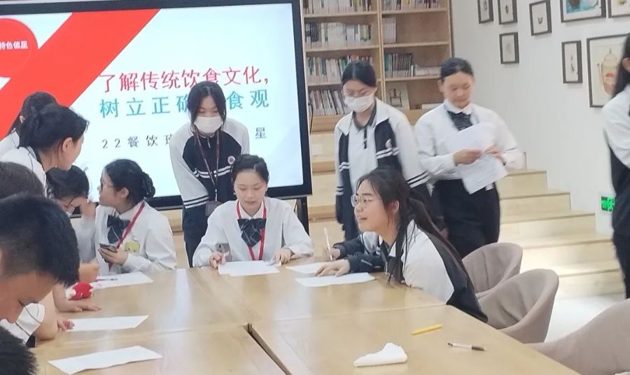 在本周三的中午,22餐管的同学们在班主任王老师的带领下在浦东校区的图书馆里举行了“了解传统饮食文化,树立正确饮食观”的特色值星活动。