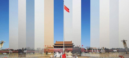 其中一张是摄影记者魏尧拍摄于2013年3月4日至17日北京的天空的连续影像记录。他每天固定一个机位(天安门广场上很多现成的白点白线可利用),固定焦距和光圈来拍摄两会期间的北京天空,然后进行拼贴,这张蒙太奇的创意纪实图片,引起了广泛而强烈的反响。